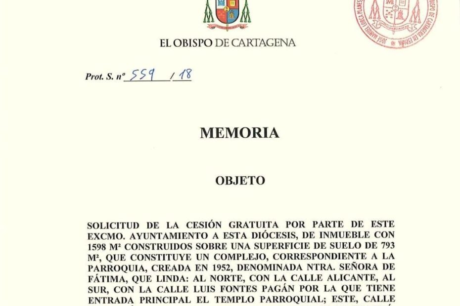 El març de 2019, el Bisbat de Cartagena va presentar davant l’Ajuntament una memòria justificativa amb l’objectiu d’obtenir la cessió gratuïta d’un immoble de titularitat pública on s’ubica el complex parroquial de Nuestra Señora de Fátima. Es tracta d’un conjunt construït el 1952, amb una superfície de 1.598 m² sobre un solar de 793 m², delimitat pels carrers Alacant, Luis Fontes Pagán, Pedro Sánchez Barba i Enrique Ayuso Miró, i identificat amb la referència cadastral 5359401 XH6055N0001 AD.